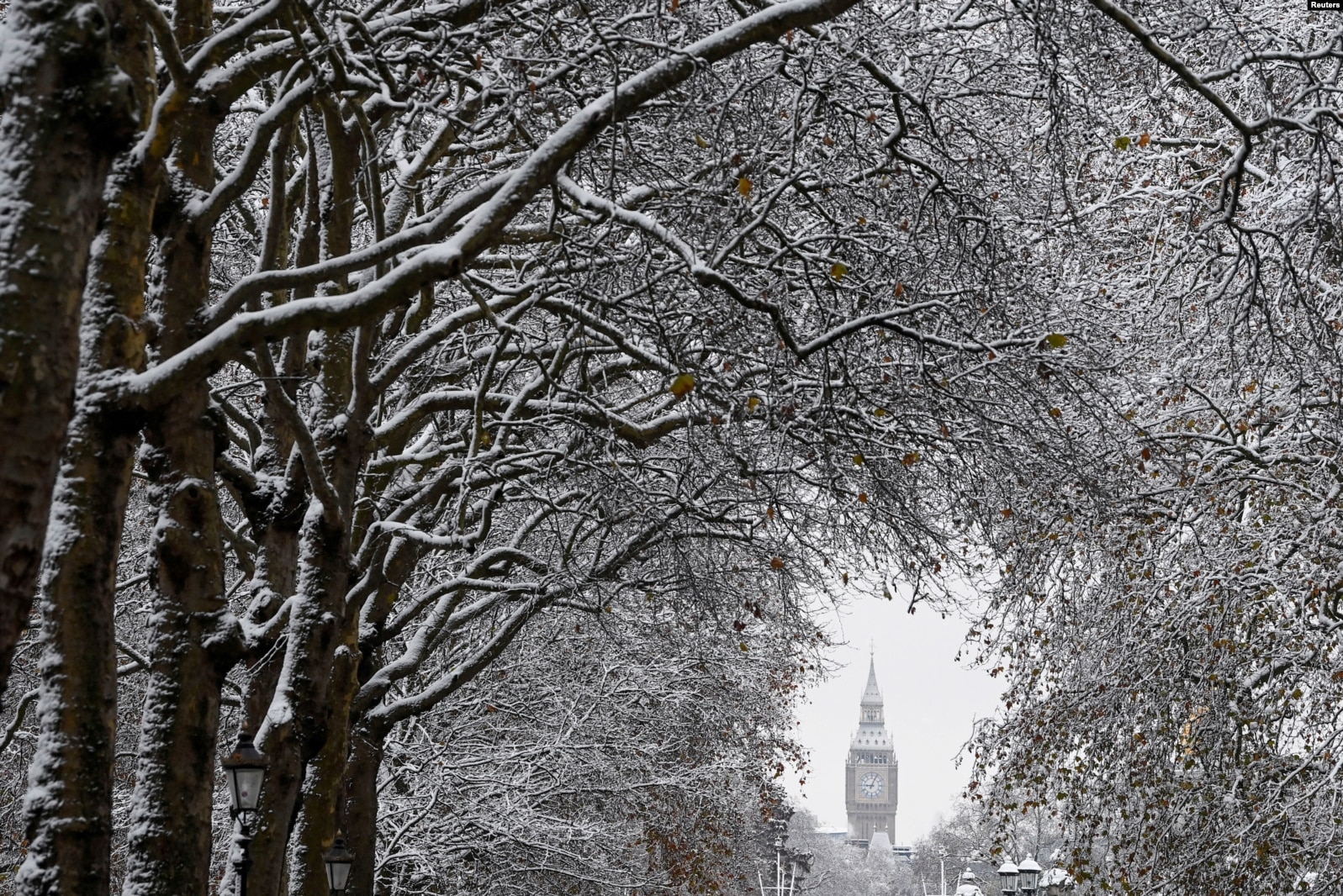 Trees are covered in snow in front of the Elizabeth Tower, more commonly known as Big Ben, in London.