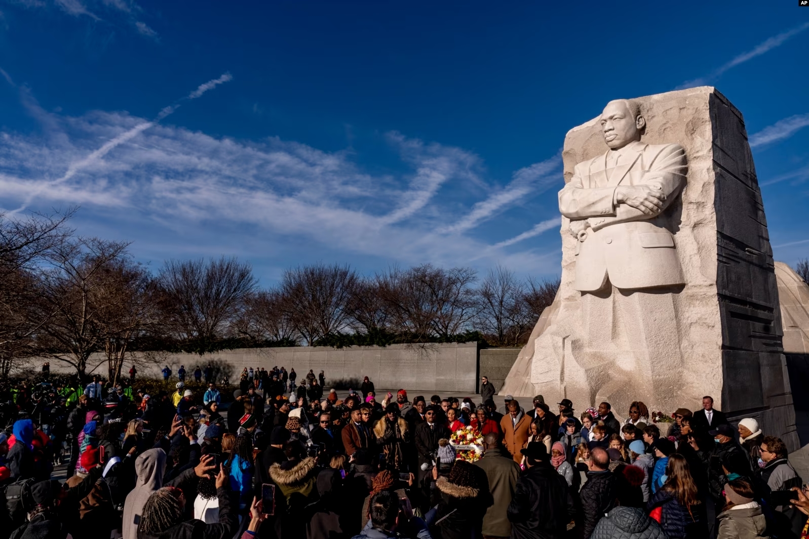 People gather to watch a wreath-laying ceremony at the Martin Luther King Jr. Memorial on Martin Luther King Jr. Day in Washington.
