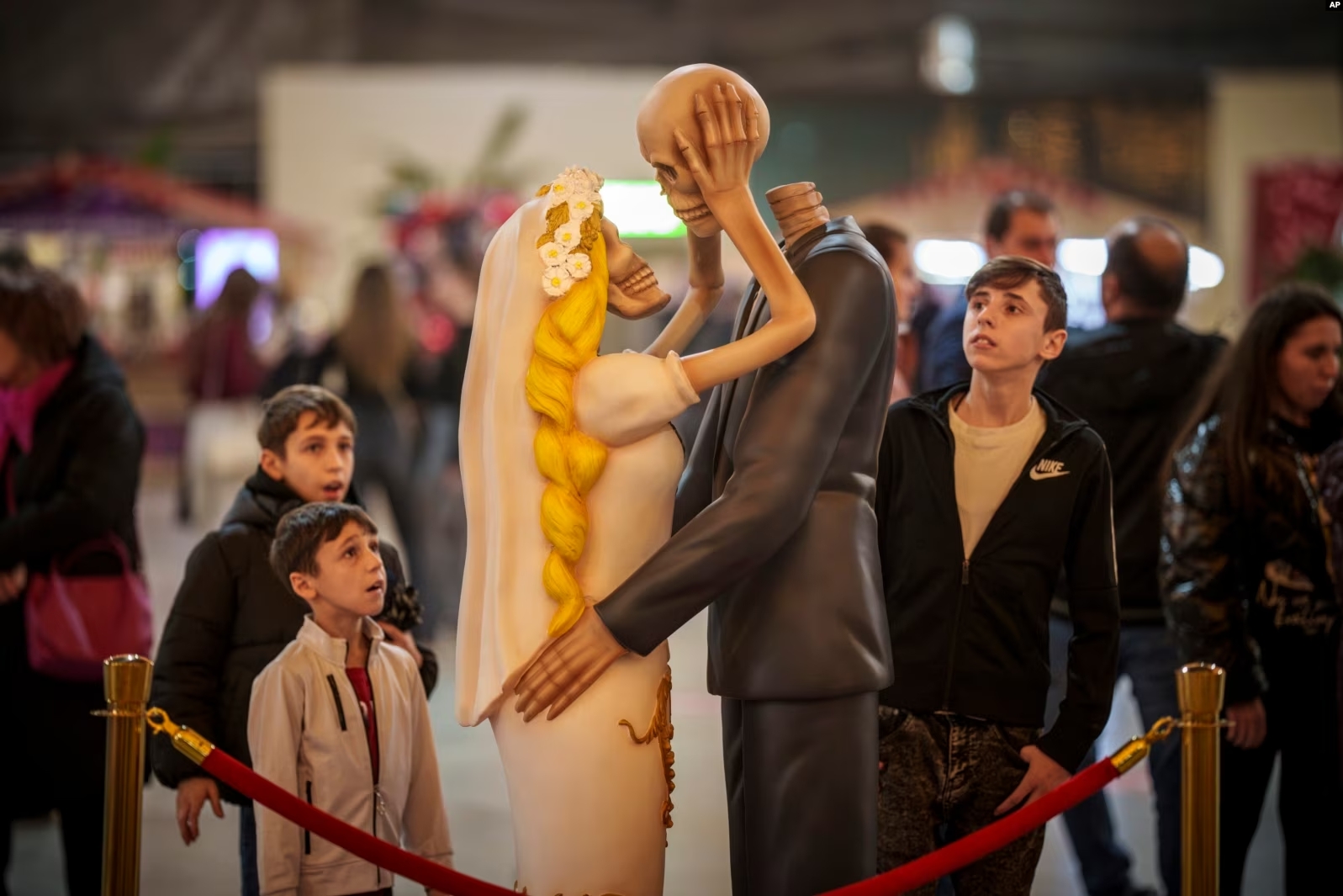People look at a skeleton couple kissing installation dubbed " 'Till Death Do Us Part" during a Valentine's Day event in Bucharest, Romania, Feb. 13, 2024.