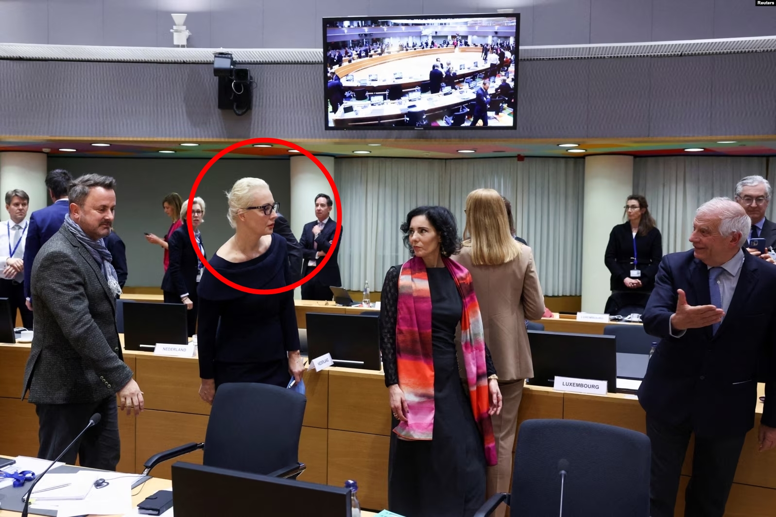 Yulia Navalnaya, the widow of Alexei Navalny, stands with Luxembourg's Foreign Minister Xavier Bettel, Belgium's Foreign Minister Hadja Lahbib and EU Foreign Policy Chief Josep Borrell, in a meeting of EU foreign ministers in Brussels, Belgium.