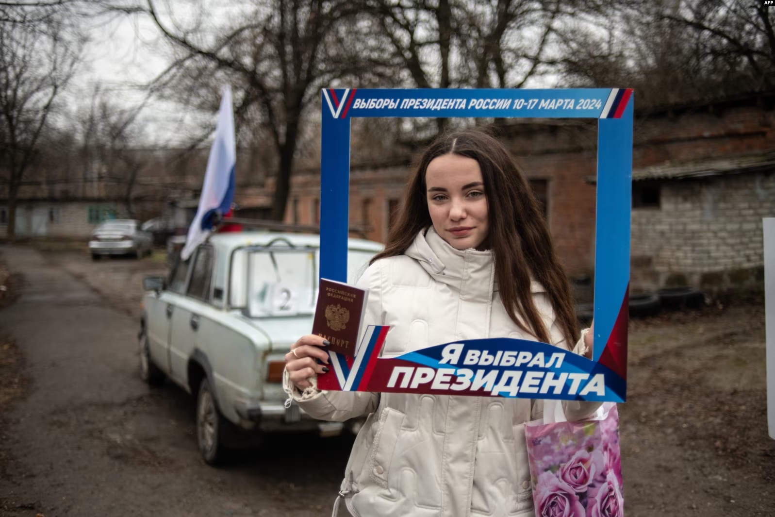 A woman poses after casting her ballot at a mobile polling station during early voting in Russia's presidential election in Donetsk, Russian-controlled Ukraine, amid the Russia-Ukraine conflict.