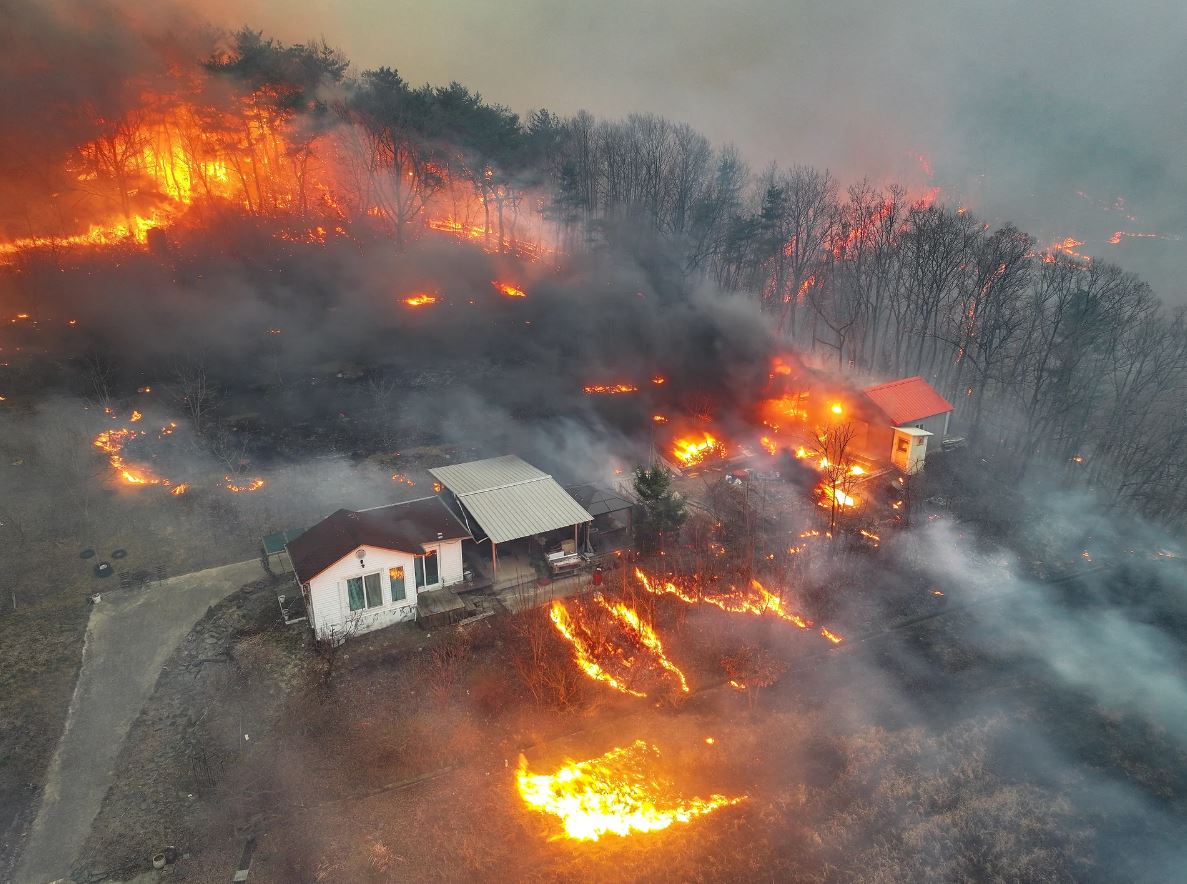 Houses burn in a village in Uiseong in North Gyeongsang province after being engulfed by a wildfire fuelled by strong winds that hit the region for the third consecutive day.